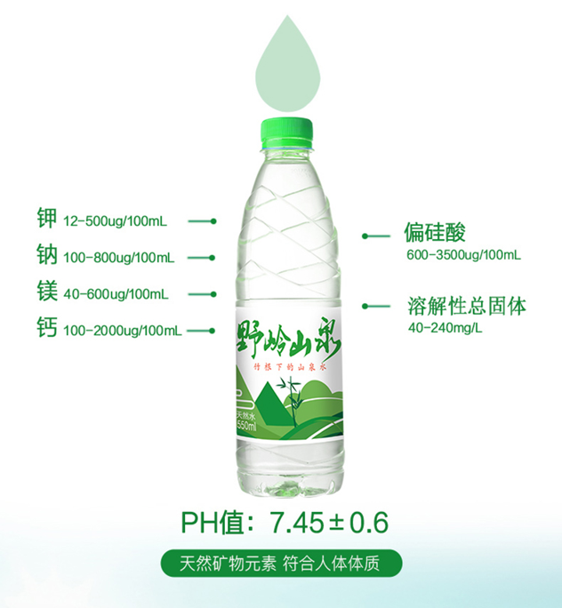 含有丰富的矿物质元素,包括钾0.5-5mg/L、钠2.0-8.0mg/L、镁0.5-6mg/L、钙3.0-15mg/L、偏硅酸8.0-35mg/L、锶0.05-0.2mg/L、溶解性总固体50-300mg/L,补充人体所需,规格是550ml*20瓶。