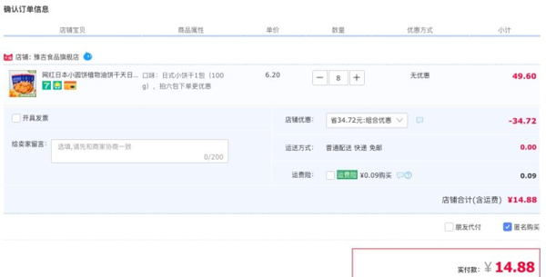 天猫豫吉食品旗舰店6.2元,有满37元减14.41元;满49元减24.72元活动,下单8件可领10元优惠券,实付14.88元到手,共100g*8袋,每袋约40个,经典海盐口味。