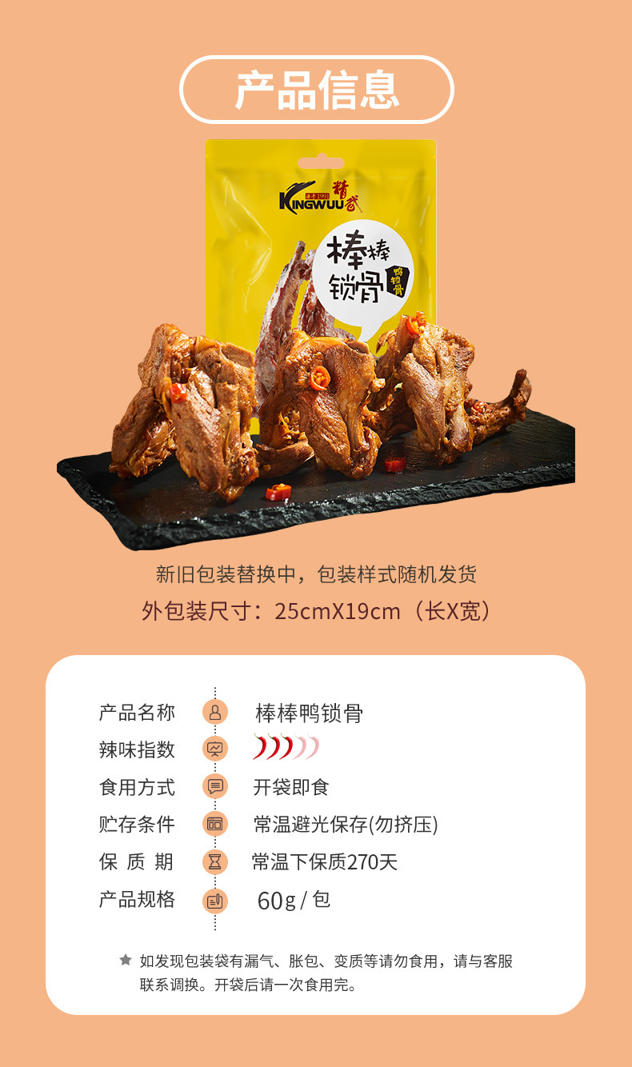 天猫kingwuu旗舰店39.9元,可领5元优惠券,第二件5元,拍2件实付39.9元到手,共到手400g*2盒,有甜辣/麻辣口味可选,精武是湖北著名的卤味品牌,这款鸭锁骨优选48天以上的成熟樱桃谷鸭制作,肉质软嫩,肉厚,经过32种卤料秘制,骨香入味,独立小包装,携带和分享方便。领券链接点此