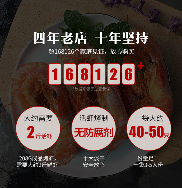 这款虾产自浙江舟山优质海域,清晨捕捞,保证大虾鲜活,从捕捞到烤制完成仅需24小时,工艺方面采用大火煮制熟透入味,在经过6-8小时不间断的低温烘烤,达到8成干度,肉质紧实,口感回甘,无腥味,越嚼越香。