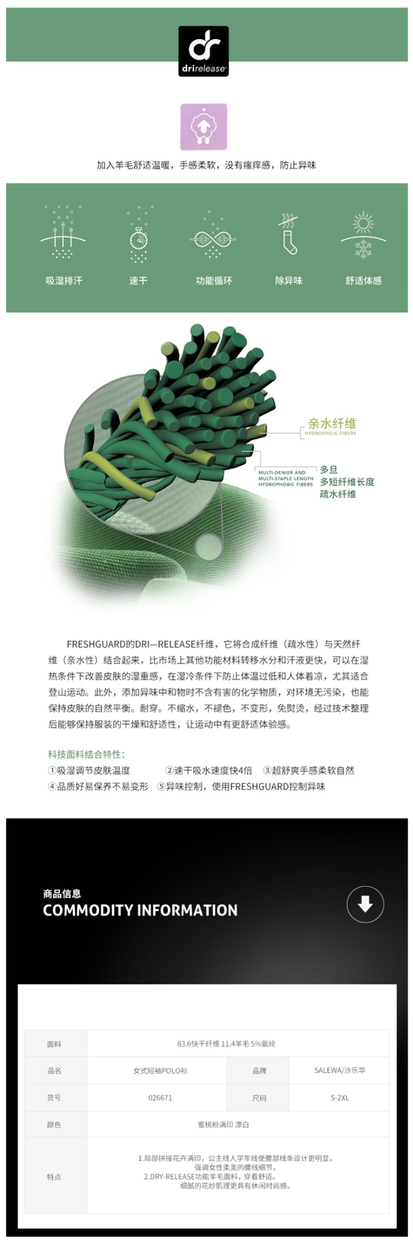 沙乐华的这款Polo衫,采用DRY- RELEASE功能羊毛面料(83.6%快干纤维+11.4%羊毛+5%氨纶弹混纺),它是将合成纤维(疏水性)与天然纤维(亲水性)结合起来,比市场上其他功能材料转移水分和汗液更快,拥有高达4倍的吸湿速干效果,尤其适合登山运动。