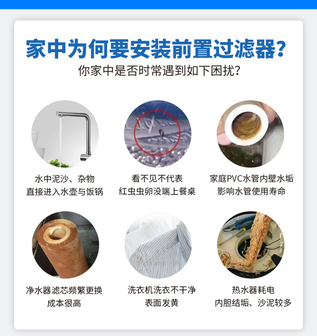 在很多老旧小区,上水如果是还是老的铁管,管道中铁锈特别多,前置过滤器是必须的;再就是高层,供水经过楼顶水箱二次加压供水,水箱的卫生不好说,前置过滤器也是必须的。
