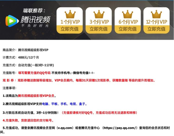 腾讯视频超级影视VIP(正价488元/年):支持 手机、平板、电脑、电视TV
