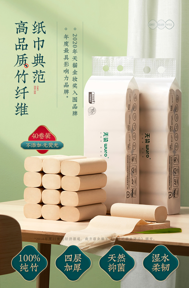 这款无染 无芯卷筒纸,精选有机慈竹纤维,纯竹本色,无有害添加,FDA食品认证,可直接接触食品,内部添加天然提取的竹锟精华,抑菌率高达98%,四层加厚,擦拭不掉屑,可代替面巾纸,卸妆纸、厨房纸,可干湿两用,强力吸水不易破,规格115*131mm 4层、70g/卷、10卷/提、10卷*4提整箱装。