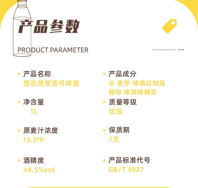 这款雪花 原浆壹号精酿原浆啤酒,规格:1L ,100%鲜活源液,直取发酵罐中的啤酒原液,不过滤、不经巴氏灭活工序,完美保留所有原始成份,保持啤酒最原始营养;零添加零色素零防腐剂,低温罐装,保留酵母活性,口味新鲜纯正,还原啤酒醇厚原味。酒精度≥4.5%VOL。