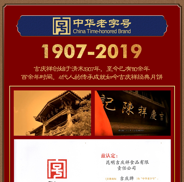 吉庆祥创立于清末1907年,百年老店,中华老字号,云南知名企业,云腿月饼也是他们家首创,产品远销全国及海外。选用宣威火腿,高原鸭蛋。食材地道,工艺和味道百年传承,皮薄肉厚,口口酥香,送运费险。