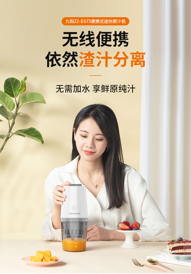 这款九阳 小型无线原汁机,迷你时尚胶囊式设计,结构精简,易安装易清洗,使用打理都很方便,大小约是市面上常见原汁机的1/3,可轻松放入背包。充电使用,满电情况下可轻松榨出12杯,自动分离果渣,出汁率约90%,无需额外加水,让你随时随地都享受一杯鲜榨100%纯果汁。