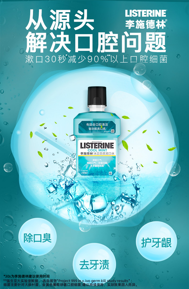 李施德林漱口水,可深入清洁口腔内部难刷部位,杀灭隐藏在牙缝间及刷牙后残留的细菌,比单靠刷牙更能有效减少牙垢膜及牙龈炎的形成。
