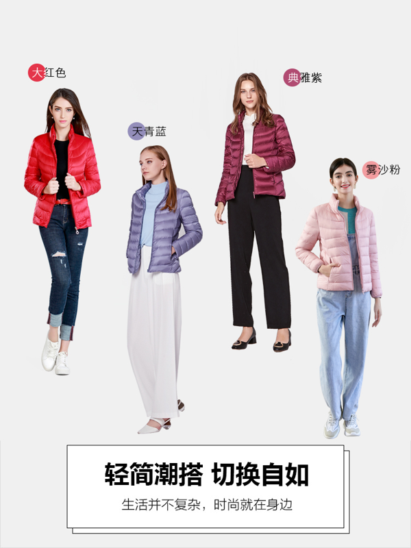 这款羽绒服,修身轻薄款式,时尚小立领设计,适合春秋比较冷和冬季不太冷时穿,选用高品质的大朵绒白鸭绒,不含杂质,含绒量高达90%,充绒量不到100g,轻暖无压迫感。大身面料外层是高密尼龙面料,内层为聚酯,舒适透气,防钻绒、防泼水,耐脏易清洗。