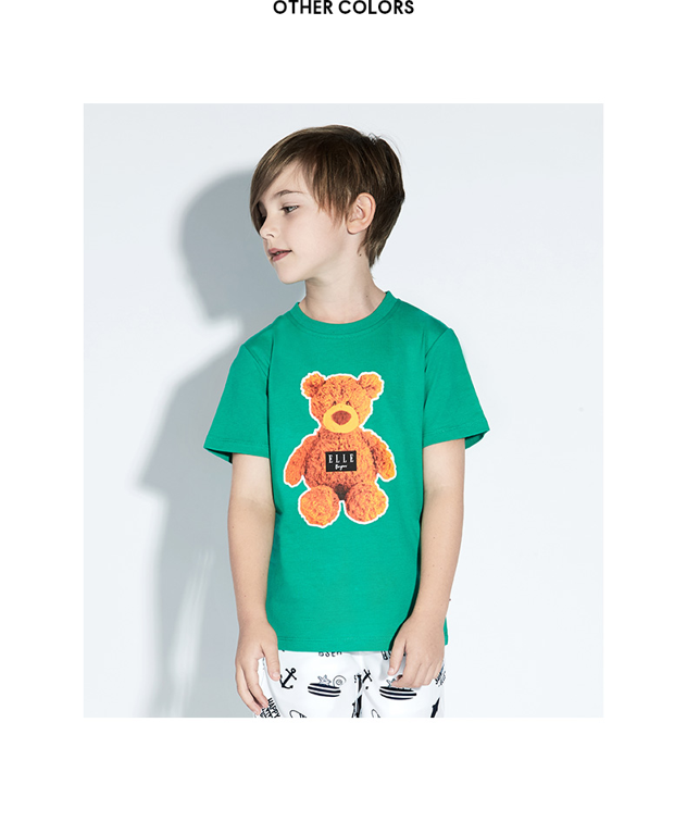 ELLE法语翻译成中文名字是“她”的意思,1945年,由Helene Lazareff在法国巴黎创立,面世后广受好评。ELLE kids 男女童圆领短袖T恤,采用100%纯棉材质,柔软舒适,透气吸汗,小熊卡通图案,童趣可爱。