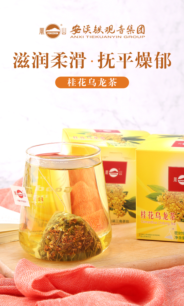 这款凤山桂花乌龙茶,精选安溪茶庄优质茶叶,搭配桂花茶香浓郁,入口清爽甘甜,沁人心脾,自然健康。独立小包装,方便便携。规格:3g*10包/盒。
