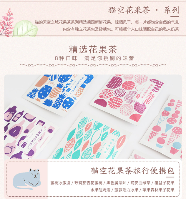 这款猫的天空之城 花果茶,茶包和糖包是单独分开放置的,选用德国新鲜水果晾晒风干,新概念三角茶包设计,锁住新鲜,冲泡时会充分浸泡,不浪费花果。外包装是进口食品级尼龙纤维包,安全卫生。