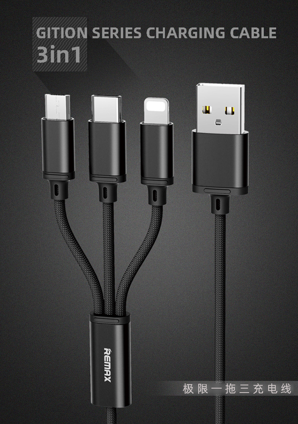 这款Remax三合一充电线,在最容易坏的线头和线身位置做了加固处理,不易发生断裂。PVC编织圆线,强韧抗拉防拽,防止缠绕;