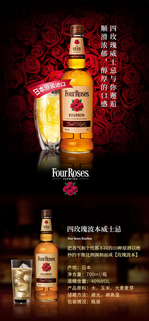 四玫瑰是用美国肯塔基州中部的土生谷物蒸酿,蕴藏在内层烧黑的橡木桶中,经过至少六年醇化期才酿制而成,酒味臻于完美。百多年以来,四玫瑰以其稳定的优良酒质和超卓的酒味,赢得饮家的喜爱。