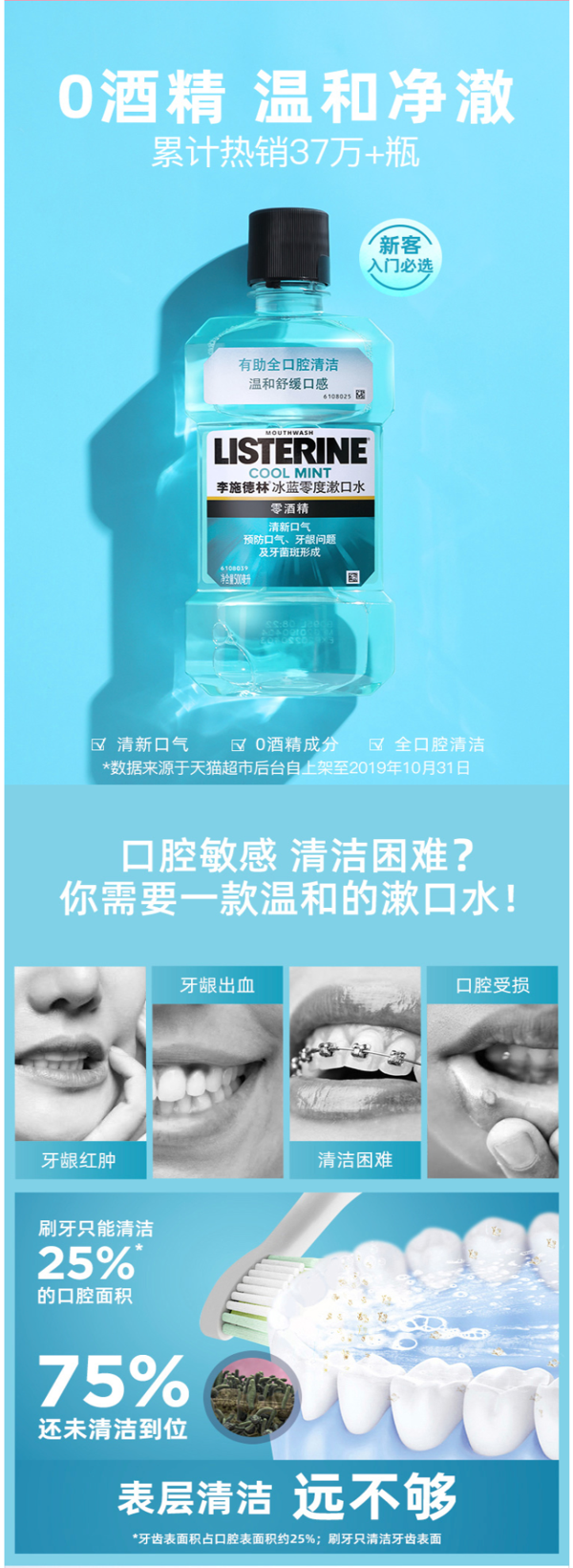 李施德林漱口水,可深入清洁口腔内部难刷部位,杀灭隐藏在牙缝间及刷牙后残留的细菌,比单靠刷牙更能有效减少牙垢膜及牙龈炎的形成。