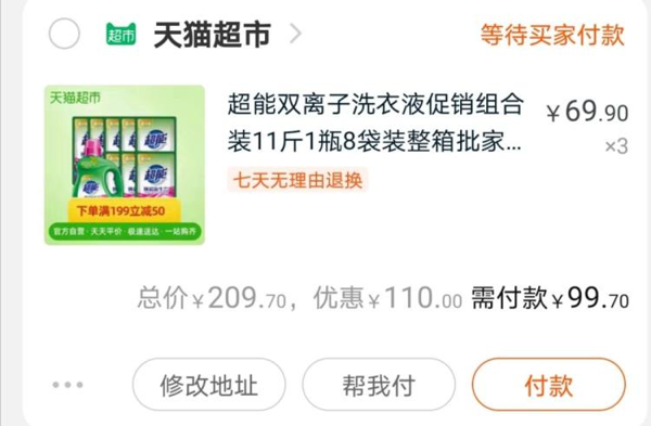 天猫超市69.9元,参加满199-50元活动,下单3件还可领199-60元优惠券,实付99.7元到手共33斤,单件包含1.5kg*桶+500g*8袋,神价的节奏,天猫超市直送,产品质量可靠。