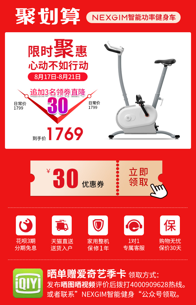 天猫nexgim旗舰店1799元,可领100元优惠券,实付1699元到手,可花呗3期免息分期,晒单送爱奇艺季卡。发布晒图评价后,拨打4000909628热线或者联系“NEXGIM智能健身”公众号领取。