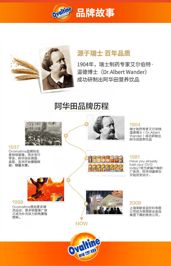 阿华田源自瑞士百年品牌,德文Ovomaltine,1904年由制药专家艾尔伯特·温德博士( Dr.AlbertWander )研制的营养饮品,在20年代的瑞士,阿华田是冰球、滑雪等体育运动的指定饮品。通常运动员比赛完,都会饮杯阿华田,既驱寒又补充体力,直到40年代,阿华田才被正式引进香港。