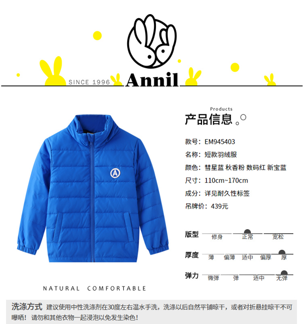 这款安奈儿中大童轻薄保暖羽绒服,轻薄款式防钻绒,含绒量: 80%;内胆外穿两相宜,采用消光春亚纺面料,柔软舒适,温柔护肤;舒适立领,触感绵软更保暖;束口袖口,阻挡寒风。