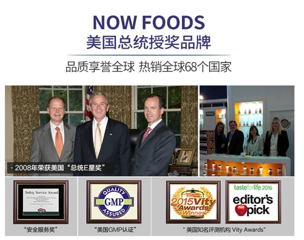 NOW是英文“Nutrition for Optimal Wellness”的缩写,意为“营养推动健康”,NOW Foods公司创立于1968年,是来自美国的知名天然保健食品品牌,总部位于伊利诺伊州。其生产的保健食品种类达1800多种,均通过美国GMP认证,远销世界63个国家。是美国发展最迅速的膳食补充剂企业,销量名列美国前三甲。2008年和2010年两次荣获美国总统“E星奖”。