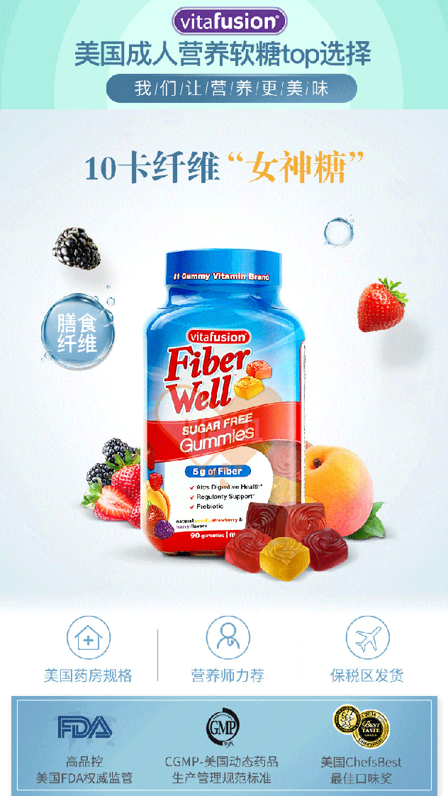 这款Vitafusion 膳食纤维软糖,美国原产,在美国的各大药房均有售卖,受到美国FDA权威监管、经过CGMP-美国动态药品生产管理规范标准,还获得过美国Chefbest最佳口味奖,可放心购买。