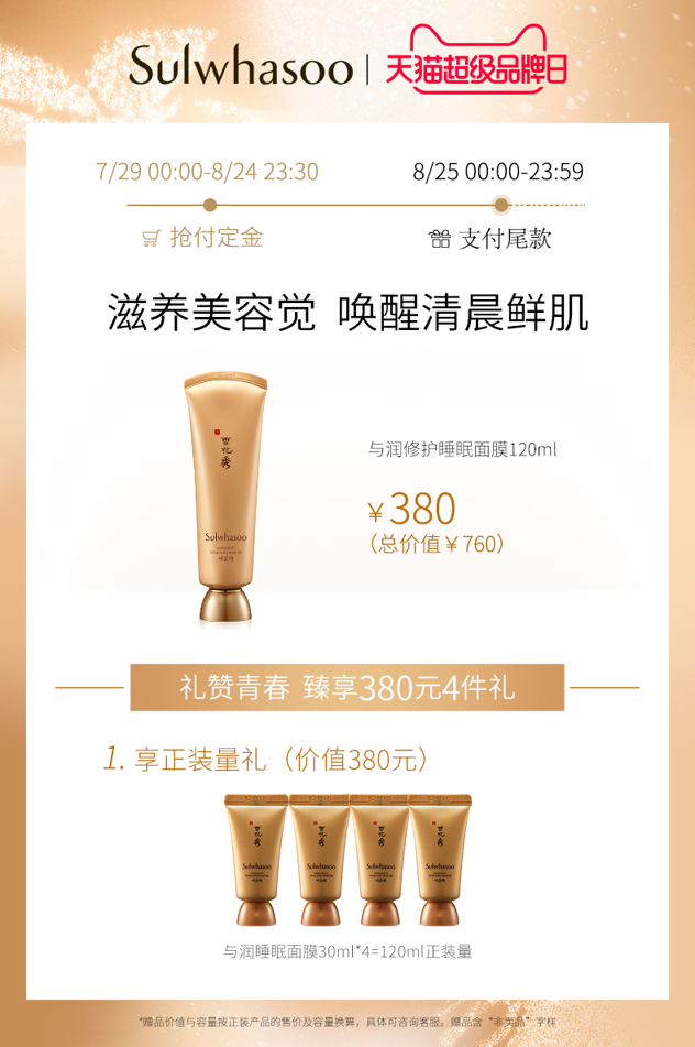 天猫Sulwhasoo雪花秀官方旗舰店0元,可领10元优惠券,实付370元到手,下单加赠30ml*4管,买120ml享240ml。