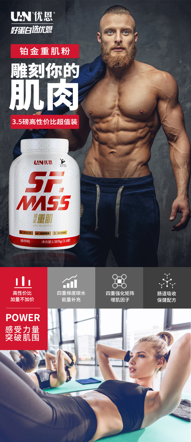 四重强化矩阵增肌因子,搭配四重梯度碳水能量补充,提供全方位营养,维持身体高代谢、快速增肌增力,还具有刺激软骨细胞、保护骨关节、防止运动拉伤的功效。