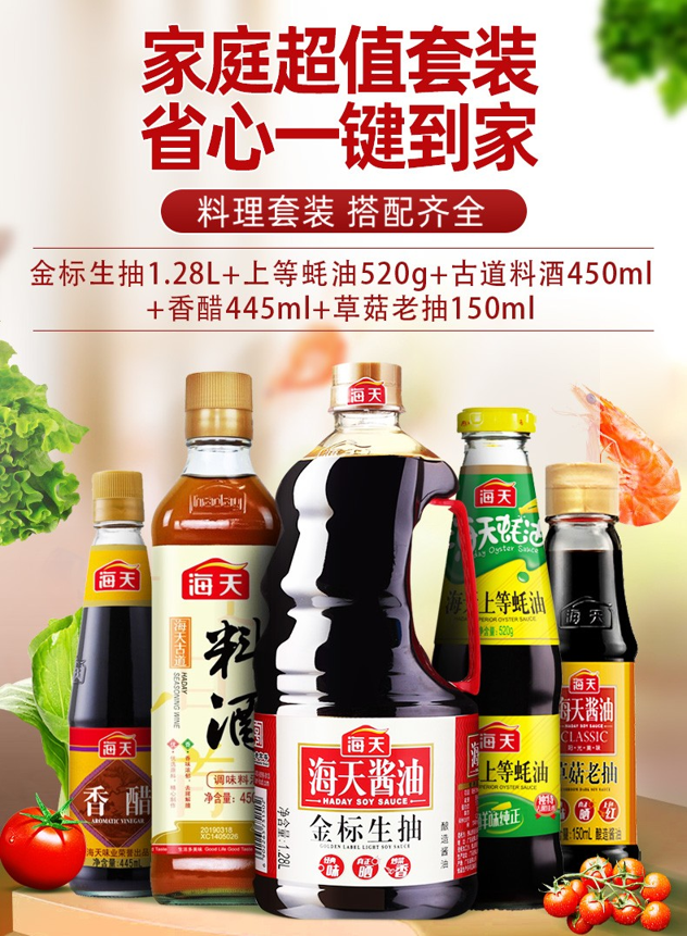 京东海天旗舰店,售价49.9元,可用10元优惠券,实付39.9元包邮到手。这款海天调味品五件套,包含金标生抽1.28L、耗油520g、古道料酒450ml、香醋445ml、草菇老抽150ml,海天品牌,一招定鲜!比超市便宜太多了,好价可屯。