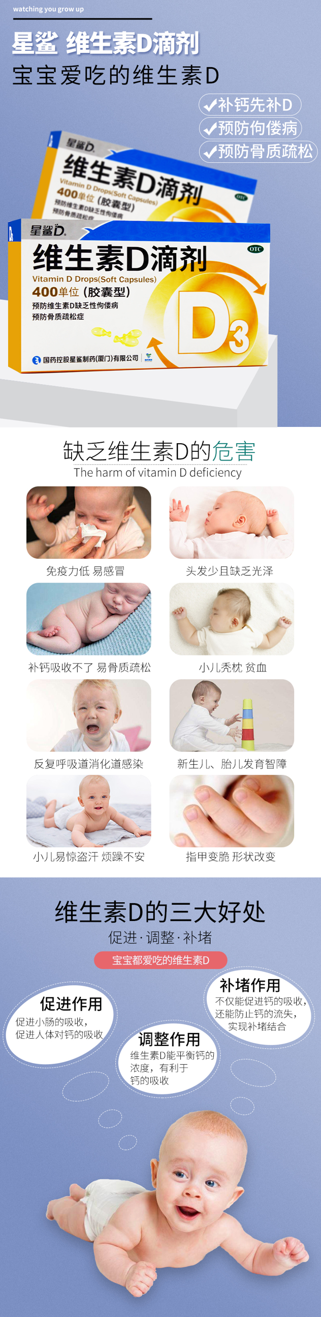 星鲨维生素D滴剂,知名品牌。补充维生素D,给宝宝补充VD和AD的,预防佝偻病,促进钙吸收~降低感冒!一盒30粒。