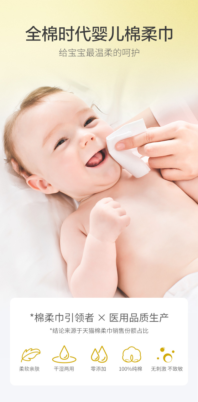 这款全棉时代 婴儿棉柔巾,规格为11*20cm。采用100%天然棉花制成,物理加工,无需任何化学添加剂成分,柔软亲肤,干湿两用,湿水后仍然保持强力,不破裂不掉絮。特别适合小宝宝敏感细嫩的肌肤。