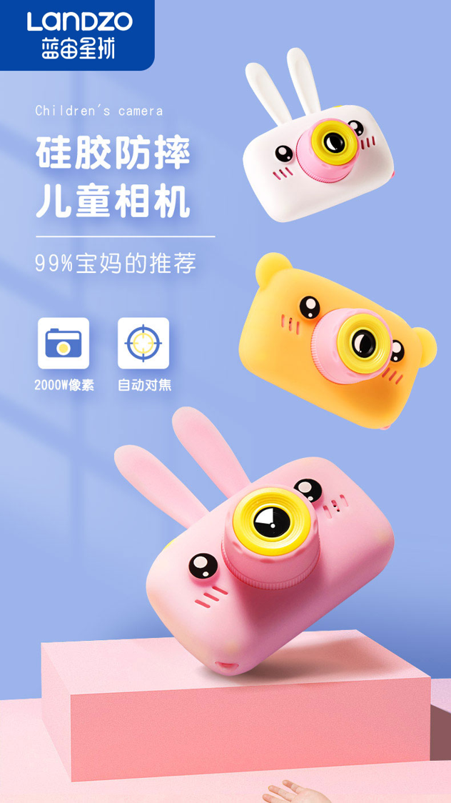 裸机经过暴力跌落测试,防摔耐用。具备DV录像功能,玩法多样。600mah大电量,充满电可连续拍照2000多张。内置趣味大头贴,都是孩子喜欢的卡通元素。