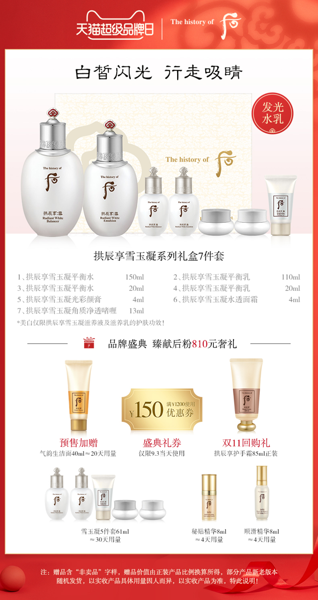 天猫后官方旗舰店1060元 到手价,可领满1200-150元优惠券,官方旗舰店出品,产品保真,赠品超多,价值超过正装。拱辰享雪水凝系列是针对各个原因引起的色素沉淀实现美白的,用到了LG全球专利全新美白成分:“甘菊萃取物”,将七香、八白散与天然菊花精心熬出后时行低温熟成的甘菊水渗入皮肤,使皮肤如白玉般晶莹剔透。