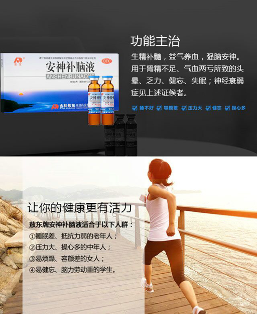 主要采用鹿茸、何首乌、淫羊藿、干姜、甘草、大枣、维生素B1等制作而成,具有生精补髓、强脑安神、益气养血等作用。规格:10毫升*40支。使用剂量:1支/次,1日2次。