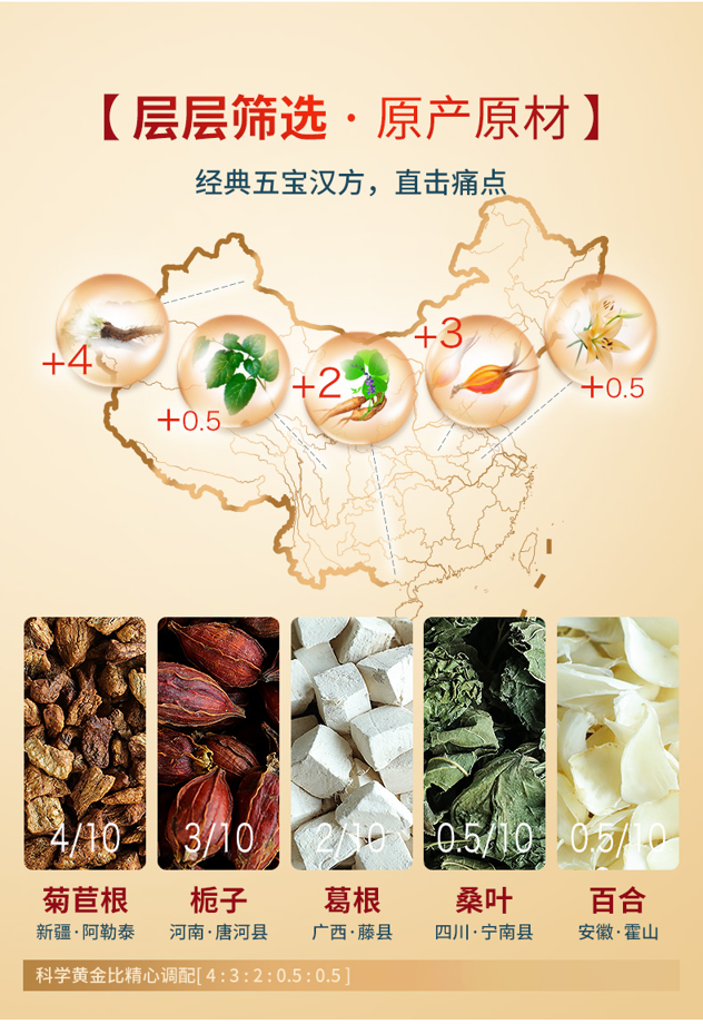 这款百年修正 菊苣栀子茶,精选新疆·阿勒泰 菊苣根、河南·唐河县 栀子、广西·藤县 葛根、四川·宁南县 桑叶、安徽·霍山 百合(按4:3:2:0.5:0.5科学黄金配比)、经过反复试验,不同材料研磨不同的粗细程度,使浸泡时析出快速全面,汤色澄亮,有淡淡清香,入口温和绵柔。食品级独立包装,双层保护,卫生便携。规格:2.5g*20包。