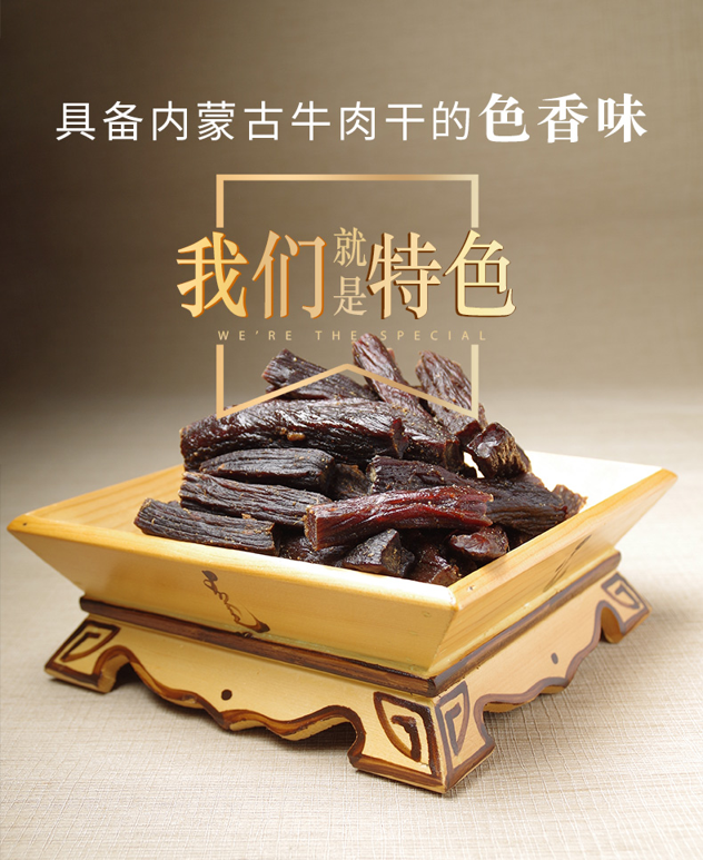 内蒙古风干手撕牛肉干,精选牛肉剔除筋膜,整条切割,腌制入味后挂起风干,七成干度,熟制后,高温杀菌,无防腐剂,肉香馥郁,嚼劲十足,充满草原的味道。老人小孩都爱吃,适合居家、办公室的日常零食。