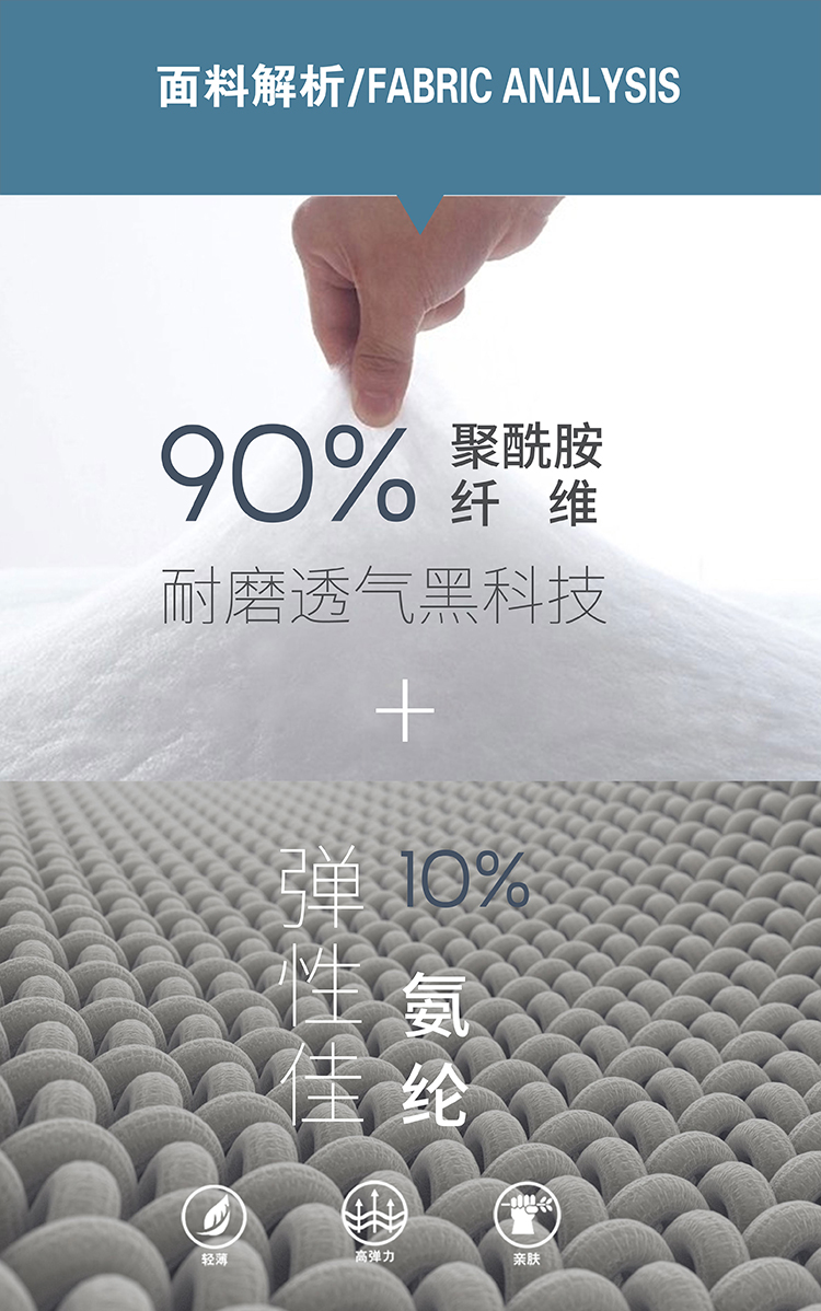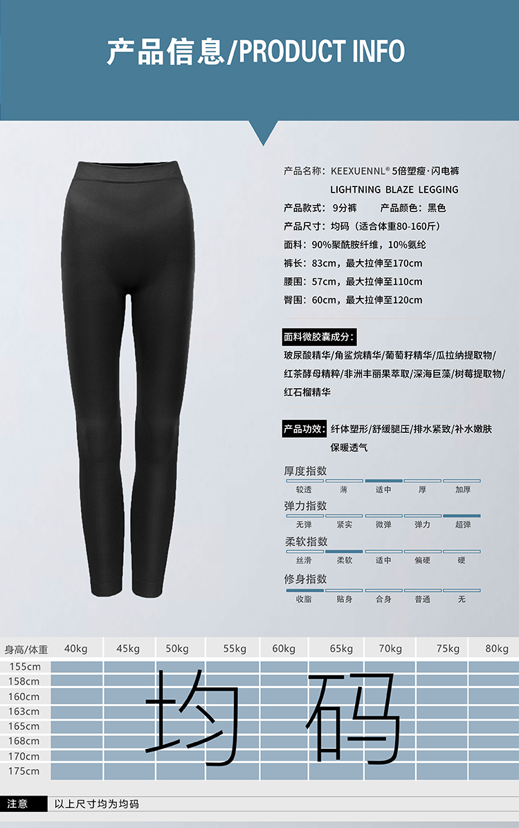 面料采用聚酰胺纤维和氨纶混纺的高弹面料,耐磨透气,一体成型无缝编织,中高腰设计,能包裹腰腹赘肉,针对和臀部赘肉,有提拉效果,轻松拥有蜜桃臀,有效塑形,不掉档。针对腰腹、臀部、和腿部、不同部位采用特殊的分区织法,各处承受不同的压力,布料与肌肤贴合更加紧密,上身舒适不勒。