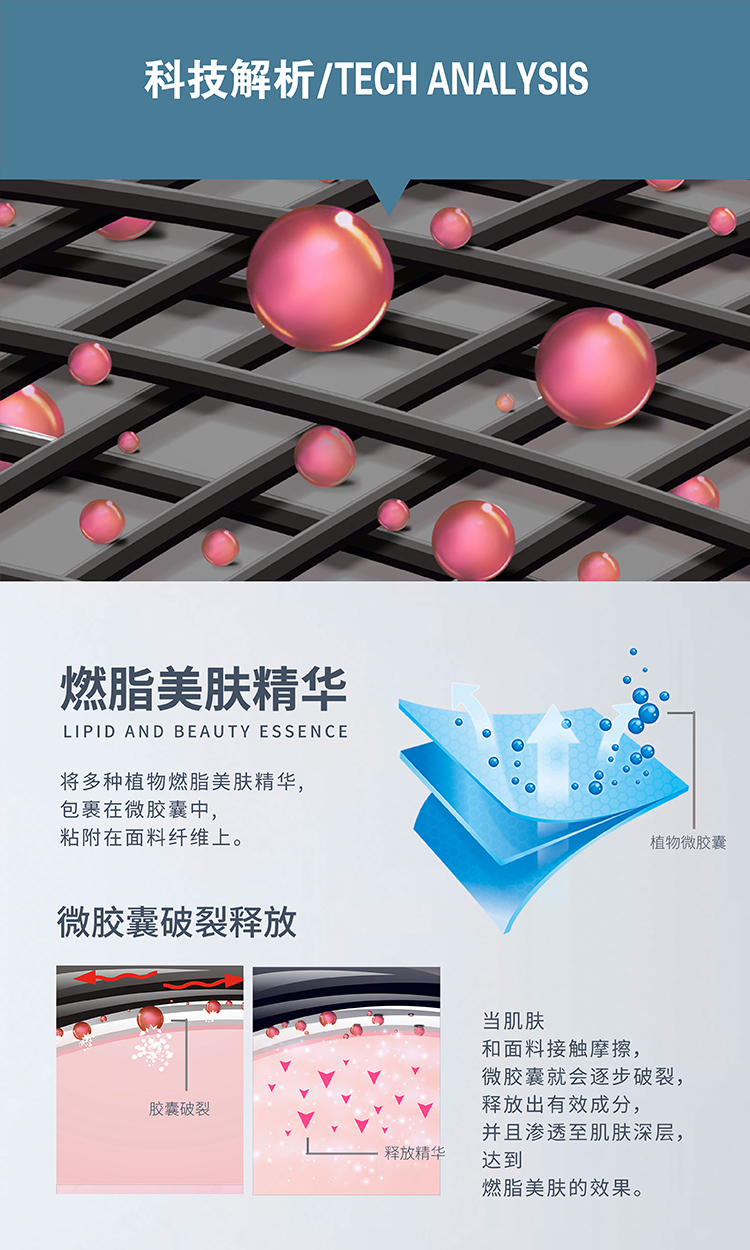 此外还采用最先研发美妆微胶囊的法国Proneem公司微胶囊,将多种植物燃脂美肤精华包裹在微胶囊中,粘附在面料纤维上,与肌肤接触释放出有效成分,达到美肤燃脂的目的。