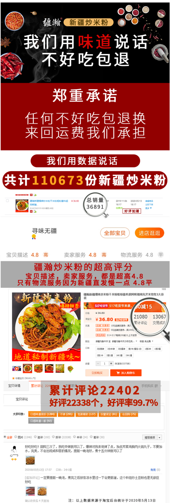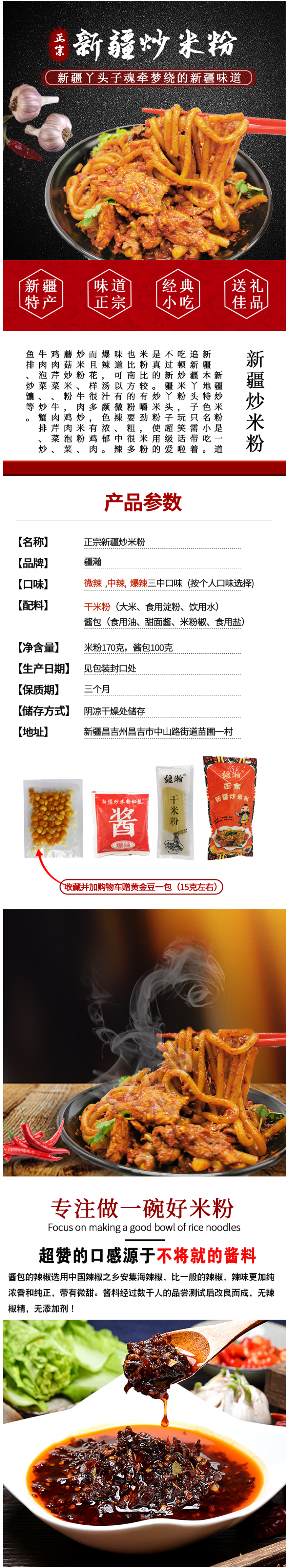 新疆炒米粉是一道新疆本地的名小吃。炒米粉使用的米粉比较粗有嚼劲,味道可以有微辣、中辣、爆辣,汤汁颜色浓郁。规格是单袋净重500g,米粉300g+酱料200g。