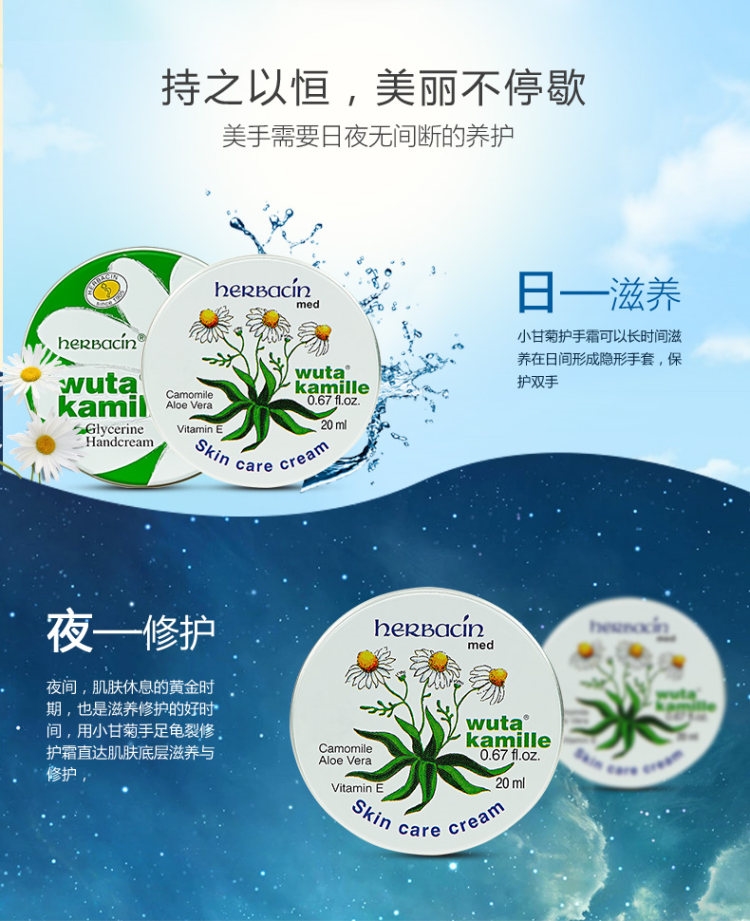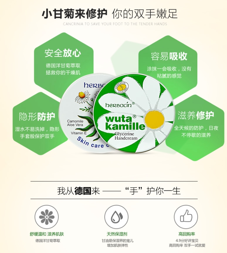这款手足龟裂修护霜是其当家产品,是小甘菊所有系列里面最最滋润的,而且可以全身使用。尤其对龟裂和冻伤效果极佳,有非常高效的修复功能。专为敏感性肌肤设计,含德国洋甘菊、荷荷芭萃取,为肌肤提供最严密的舒缓与柔润效果;芦荟露可立即保湿肌肤;维他命A可以稳定肌肤结构;维他命E更可以防护细胞组织;可完整防护龟裂部位肌肤,最适合手、足的干裂、冻伤或是化学品蚀伤。