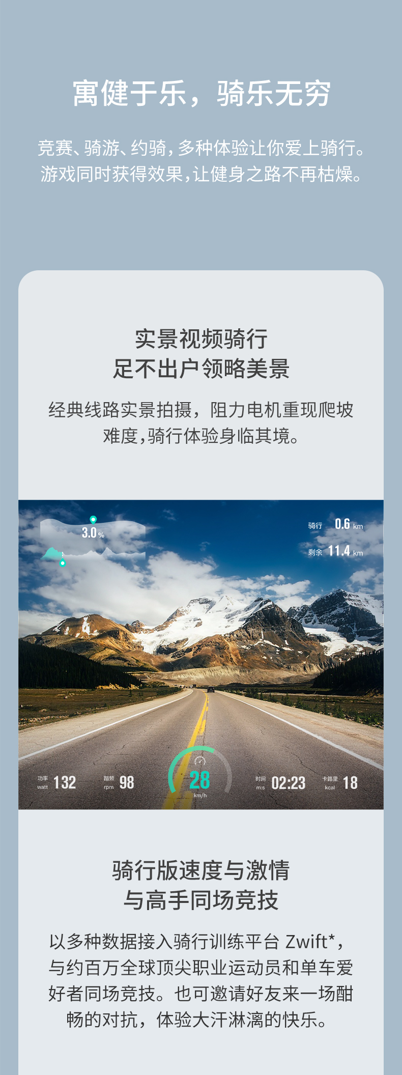 支持适配第三方骑行游戏平台,如zwift、顽鹿竞技等,使用zwift可以跟全世界进行竞技比赛,这样实景视频的骑行,比起单纯一个人骑行更有意思,同时也能更好的坚持骑行,毕竟还是比赛更刺激。