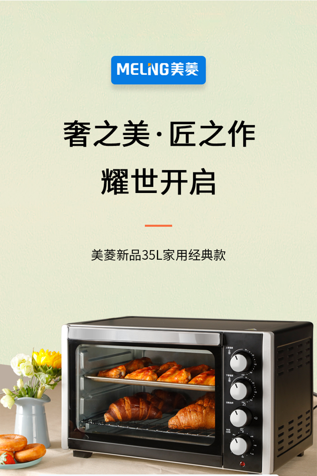 天猫美菱卡萨丁专卖店319元,可领130元优惠券,实付189元到手,经典老牌美菱,35L大容量烤箱,可以烤整鸡,11寸的pizza能烤3个,蛋挞能烤36只,上下独立控温,四层烤位设计,70-230度广域控温,可以烘烤出不同口感,120分钟常通定时器,四钮简单操作,小白也能轻松上手。