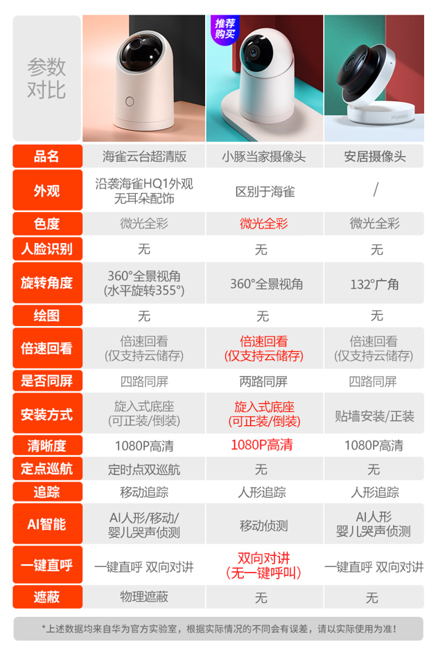 天猫华为良米专卖店168元,可领5元优惠券,实付163元 到手,第3款此价,还有安居,海雀款可选,建议购买小豚当家,区别可见下图。小豚当家AI全彩摄像头,是采用华为海思首颗28nm家庭AI芯片的产品。相比较传统家用摄像头夜间只能使用黑白侦测,小豚当家AI全彩搭载新一代AI图像增强技术,可以保证在夜间微弱光线下,依然能显示更丰富的色彩、更清晰的画面。