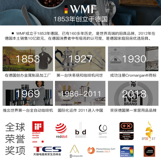 天猫wmf至梵专卖店219元,可领50元优惠券,实付169元到手。WMF是德国家居的领导品牌,的中文名是福腾宝(也叫完美福),是有着150多年历史的德国著名厨具品牌,与德国双立人、菲仕乐同为最知名的厨具品牌。