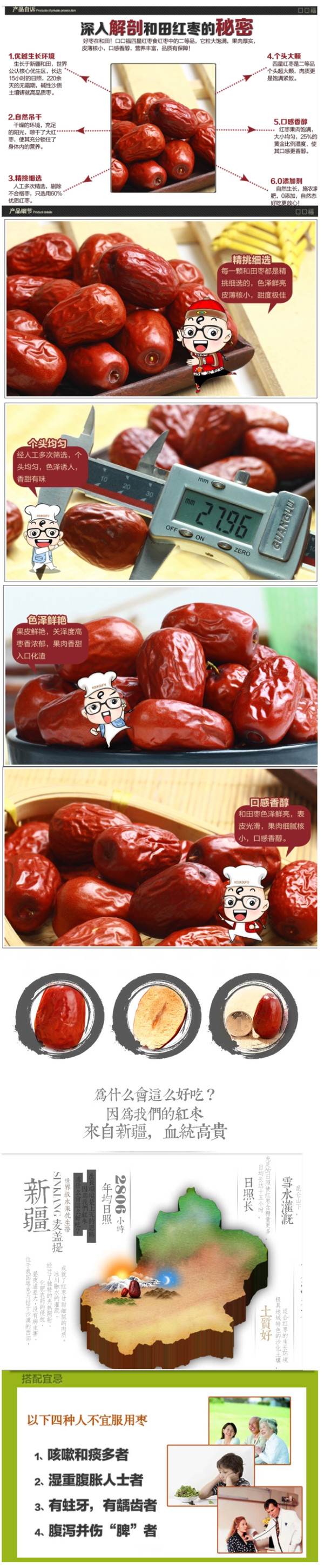新疆和田枣,个大均匀,皮薄核小,肉质饱满紧致,果皮鲜艳光泽度高,枣香浓郁,25%的黄金比例湿度,果肉香甜入口化渣。完全的农家自然生长,无任何添加剂,绿色健康。可以煲汤,熬粥,泡茶或直接吃,是很好的食补品。