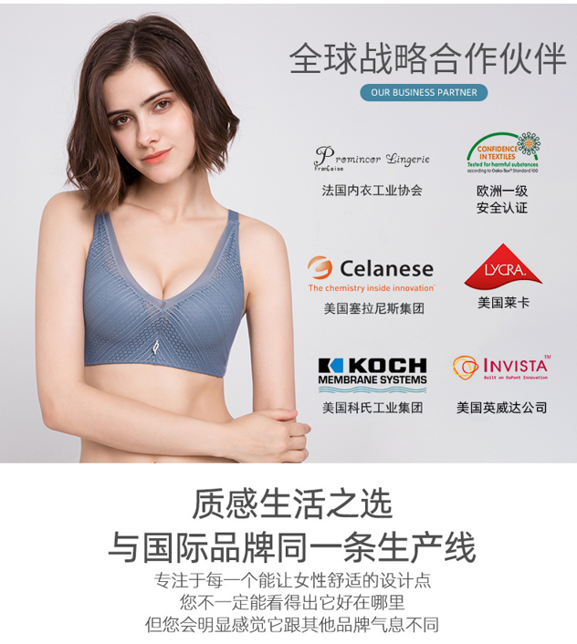 文胸采用美国Celanese集团进口Nilit Softex超细旦纱线、Sensil Bodyfresh抗菌纤维,和美国英威达公司的莱卡纤维,采用意大利无缝编织技术,舒适一体成型。欧标1级安全认证,面料健康、柔软细腻,真正的达到无痕轻盈享受。