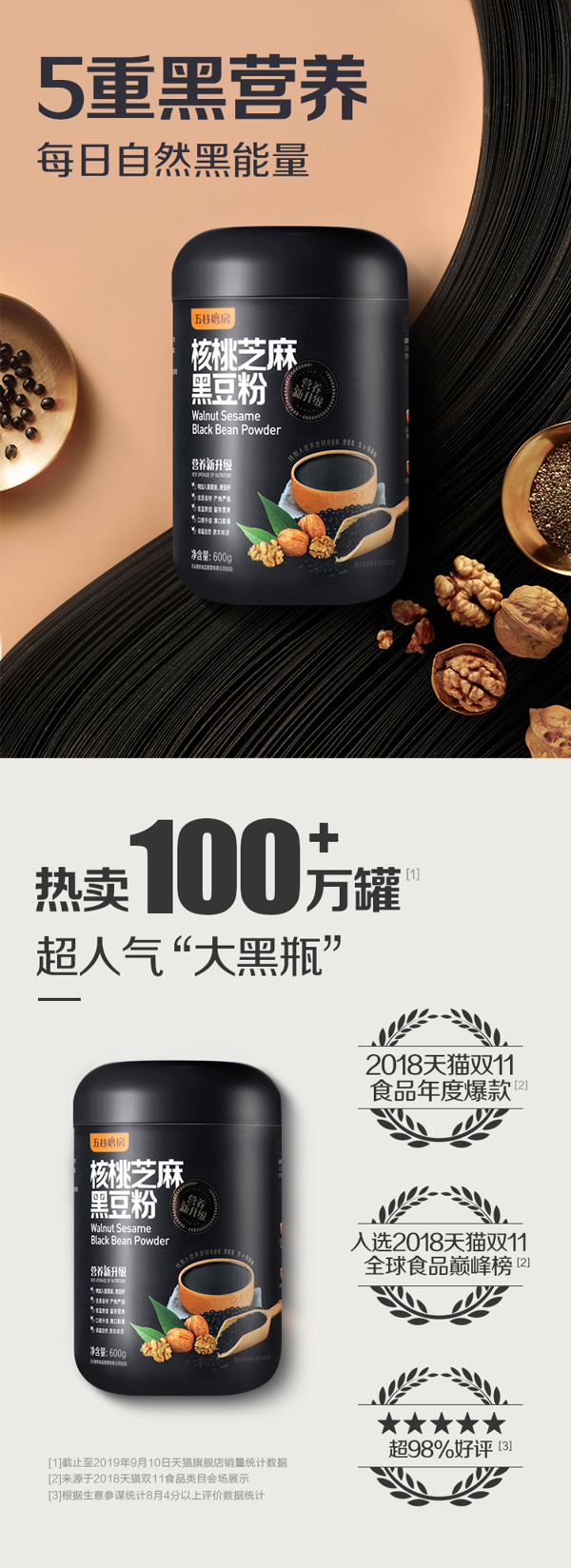配方超强升级,核心成分来自云南的核桃仁>10%、鄱阳湖黑芝麻>23%、东北黑土地黑大豆>29%,特别添加了墨西哥奇亚籽、黑藜麦、黑米、山药等。