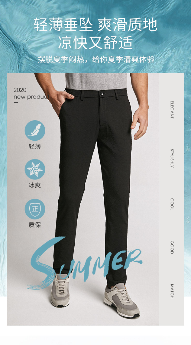 这款休闲裤面料采用锦纶51%+粘纤46%+氨纶3%混纺,这种面料自带褶皱纹理,透气性强,手感光滑,不易起球,固色性好,同时拥有粘纤的透气性,锦纶的耐磨性和氨纶的弹性,同时可快速吸湿排汗,夏季穿着非常舒适。