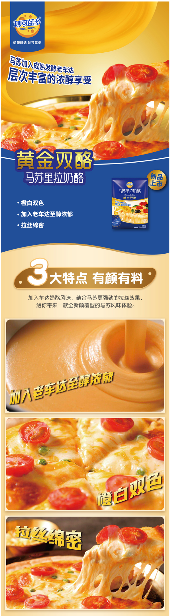 这款妙可蓝多 马苏里拉黄金双酪芝士碎,新升级配方,加入了车达奶酪,切丝细腻,拉丝长绵,润滑且富有弹性,橙白双色,颜色非常漂亮,奶香也浓郁,拉丝无需切块,直接使用可用于制作披萨、炒饭。