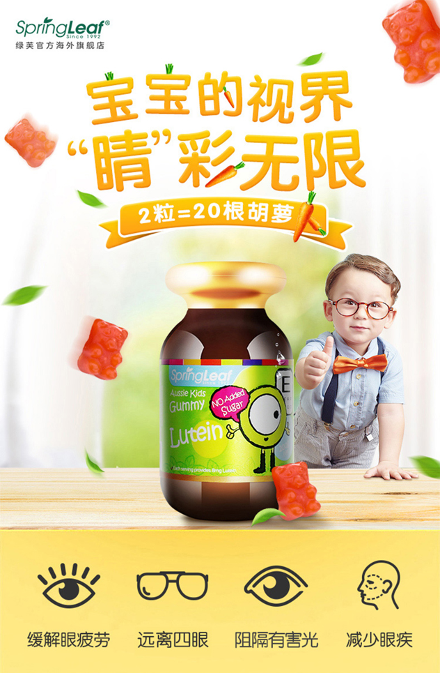 澳洲原装进口的儿童叶黄素软糖,首创不添加糖技术,采用天然果汁调味调色,每天2粒,抵20根胡萝卜的叶黄素含量,有效缓解视疲劳,阻隔有害蓝光,预防近视,保护孩子视力,软糖设计,小熊形状,奇异果味道,孩子爱吃。规格200g,约85粒。
