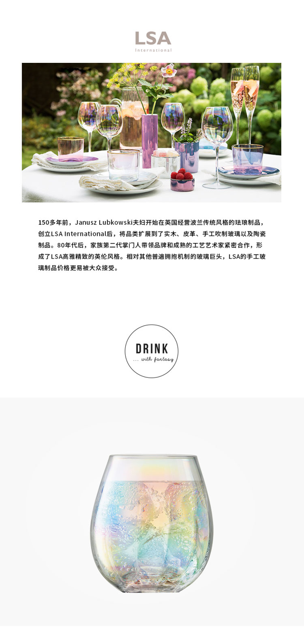 LSA Pearl灵感来源于阳光下贝壳的光泽,每一件都是手工描绘,闪耀若隐若现的珍珠光彩,富有灵动曲线、造型柔和,杯壁上彩虹色的珍珠光泽,仿佛把一颗珍珠捧在手心。杯子的表面有一些起伏的棱纹,让每个角度都有不一样的色彩。